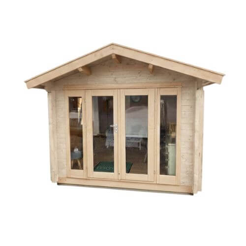 Like all Logspan cabins, it’s made from sustainably grown Scandinavian spruce. Each cabin includes a small, 70mm, treated wooden base frame to protect the bottom, but the rest of the timber must be treated immediately after assembly to ensure it lasts.