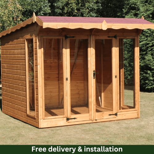 The Clumber Summerhouse is an excellent feature for your garden and is offered in a range of sizes. Quality features include contemporary full height double doors with black antique hinges and fixed windows to the front and sides. Toughened glass is included as standard. A georgian door and georgian opening windows option is also available. The front roof canopy is 485mm wide and has felt roof tiles in a choice of colours.