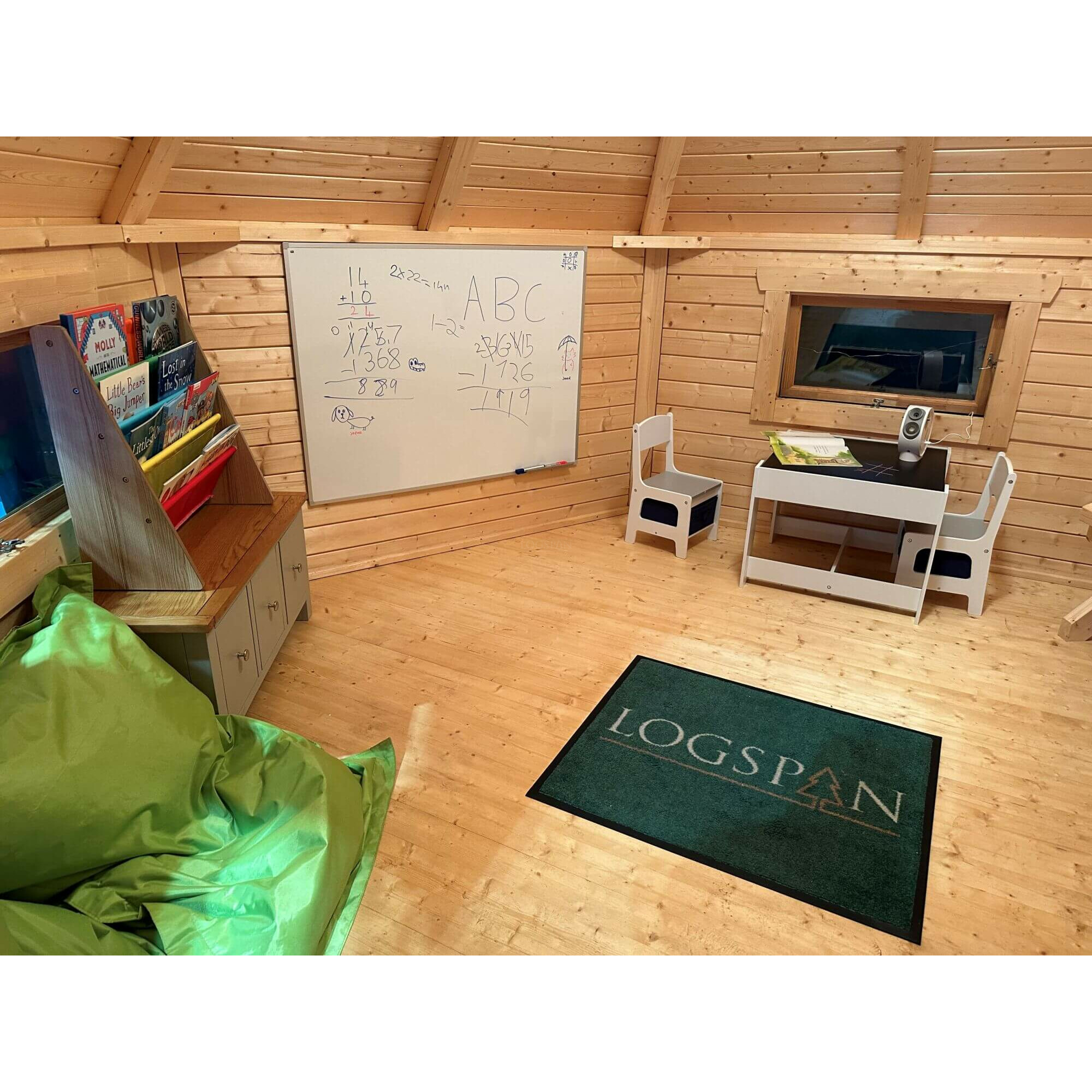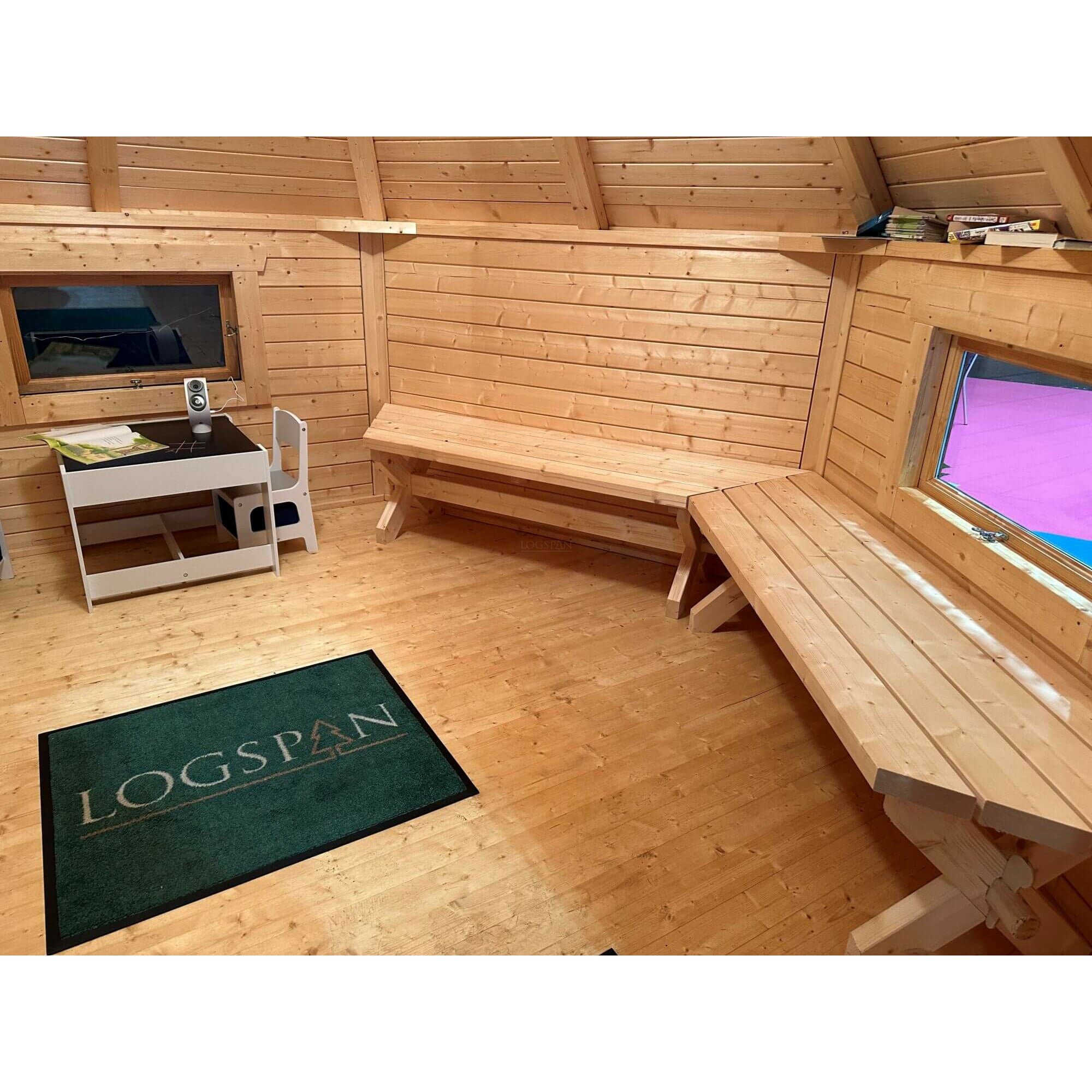 The construction of the Finman is made from sustainably slow grown Scandinavian spruce and the walls are 45mm thick throughout. This version of the Finman Classroom is the baby at just 4m in diameter but can still seat up to 20 children! This isn’t going to be blowing away in the next storm! Included is all the bench seating for the whole class.