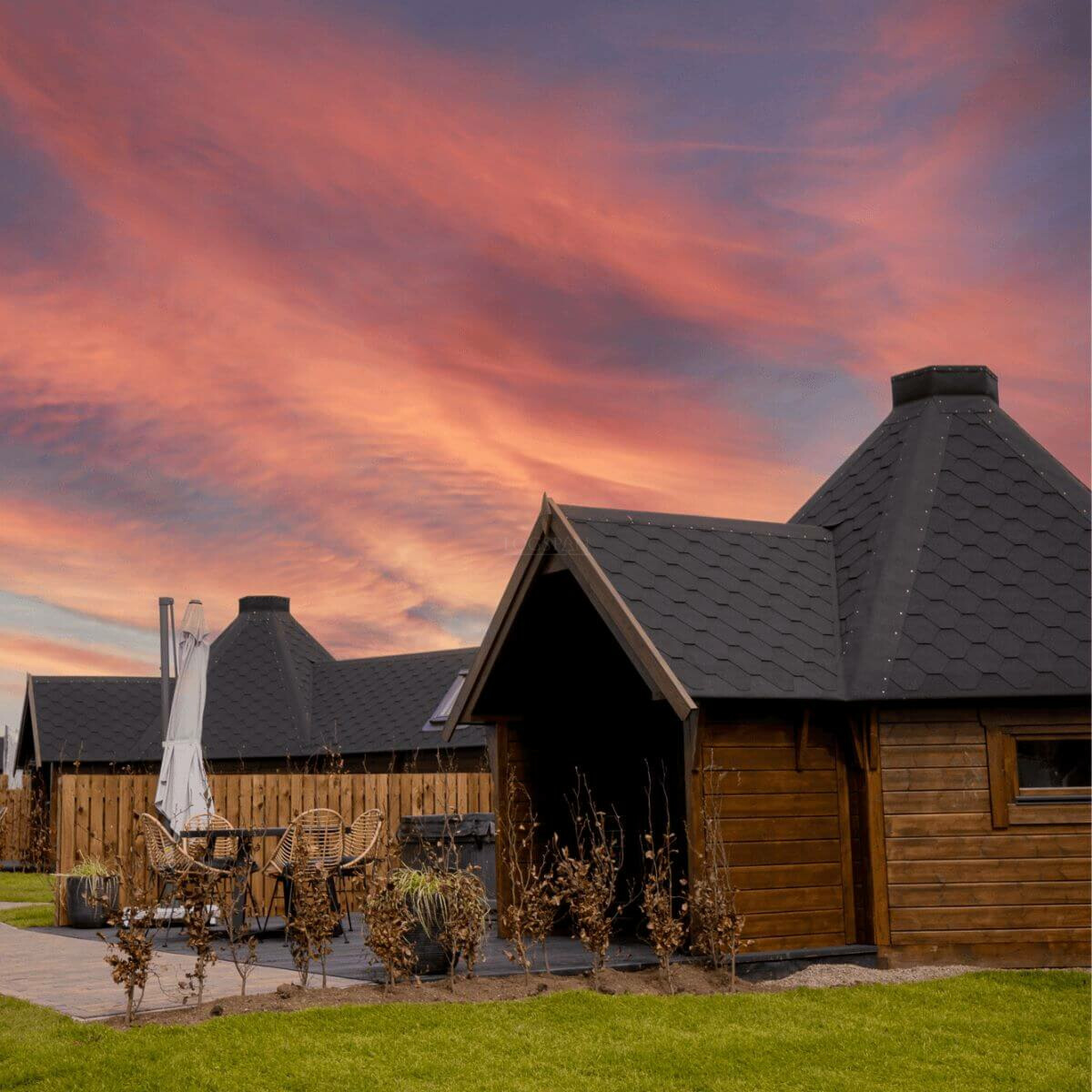The 17m2 Finman Sleeper cabin with 2.8m Rear Extension, rear opening window, door, frame, and diving wall for the en-suite area, shingles in your choice of colour - Red, Green or Black.The walls are 45mm (nearly 2”) thick and all windows and doors are fully double glazed.