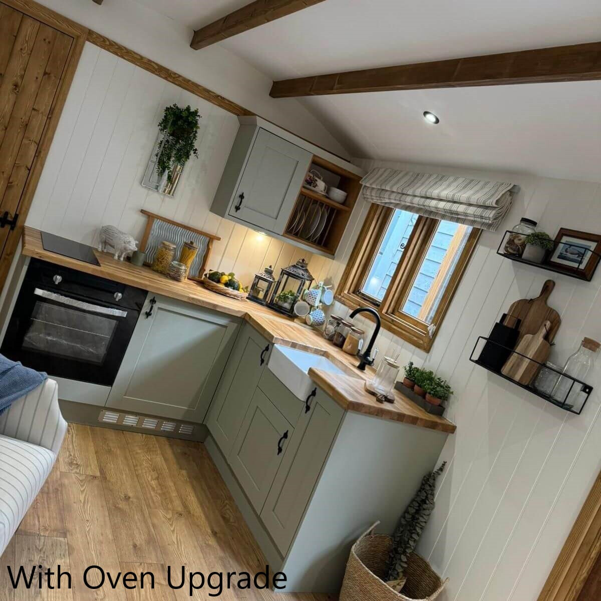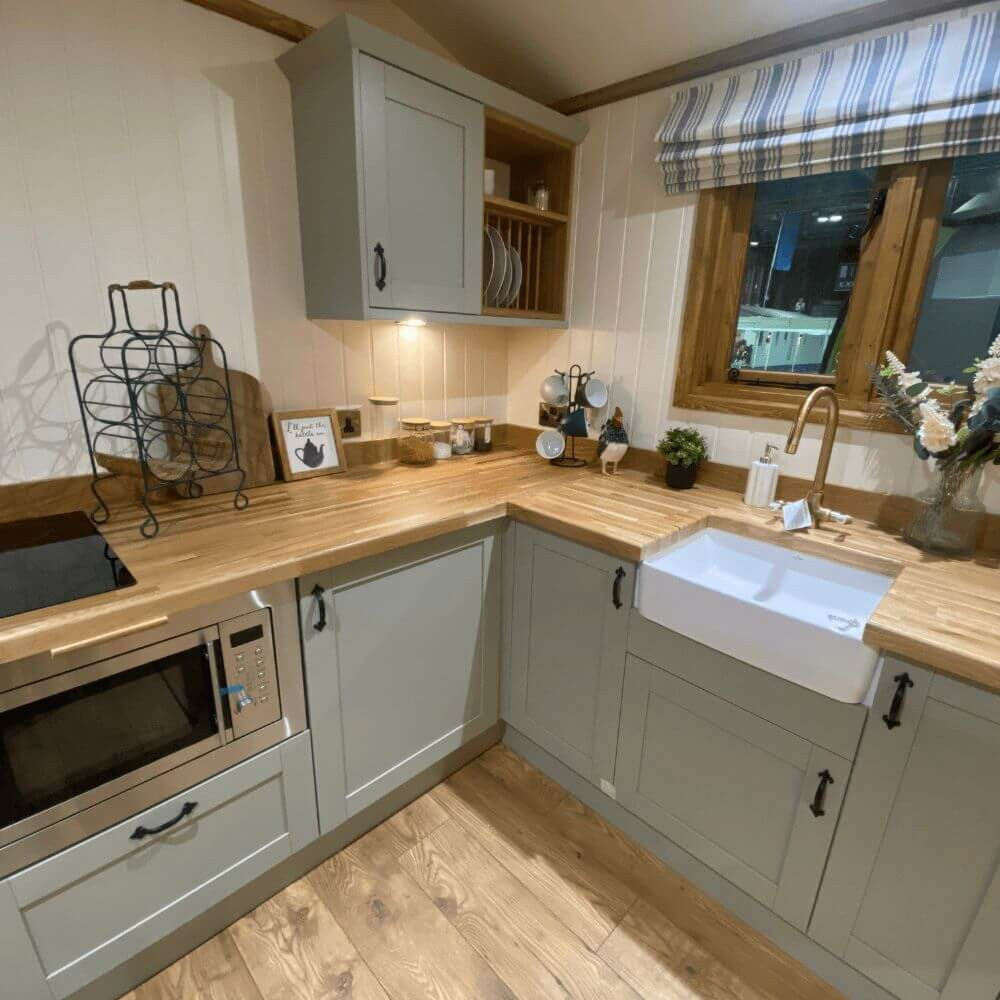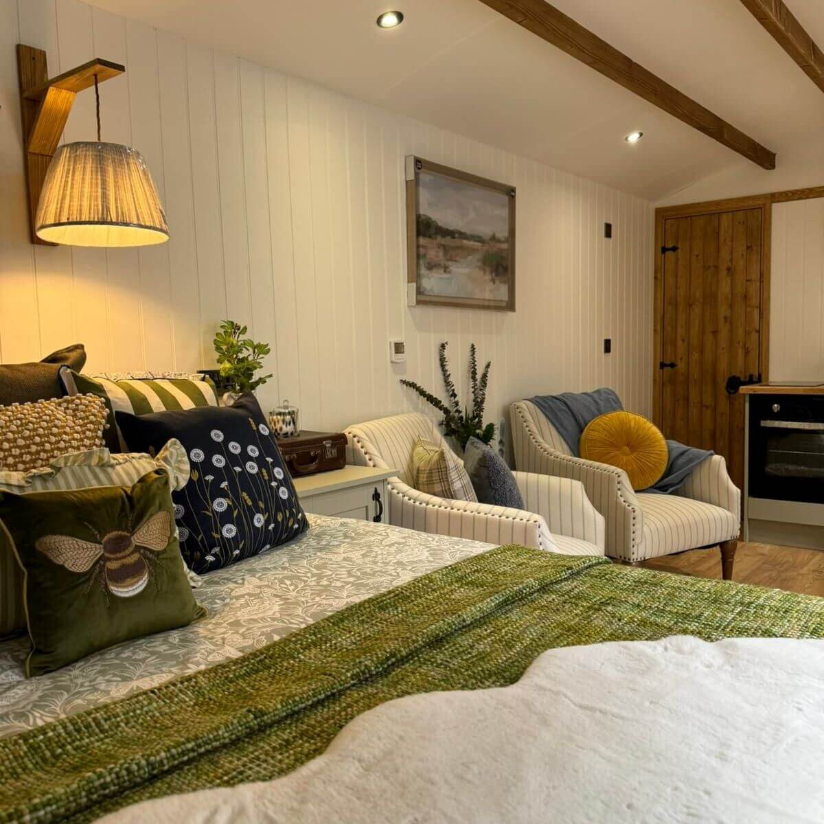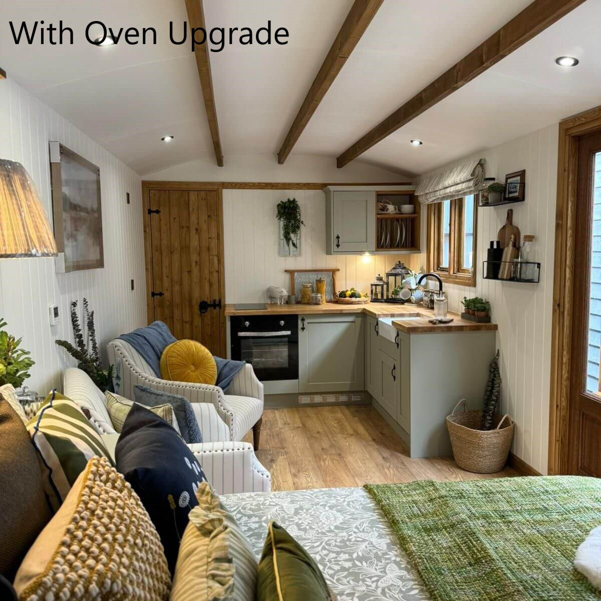 Our Jura Shepherd Hut is light and airy, with three double-glazed windows in the main living area and a pair of double-opening doors.