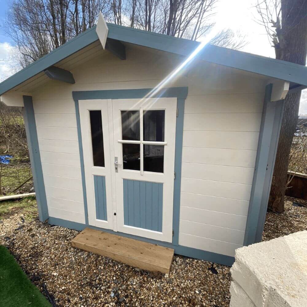 Like all Logspan cabins, it’s made from sustainably grown Scandinavian spruce. Each cabin includes a small, 70mm, treated wooden base frame to protect the bottom, but the rest of the timber must be treated immediately after assembly to ensure it lasts.