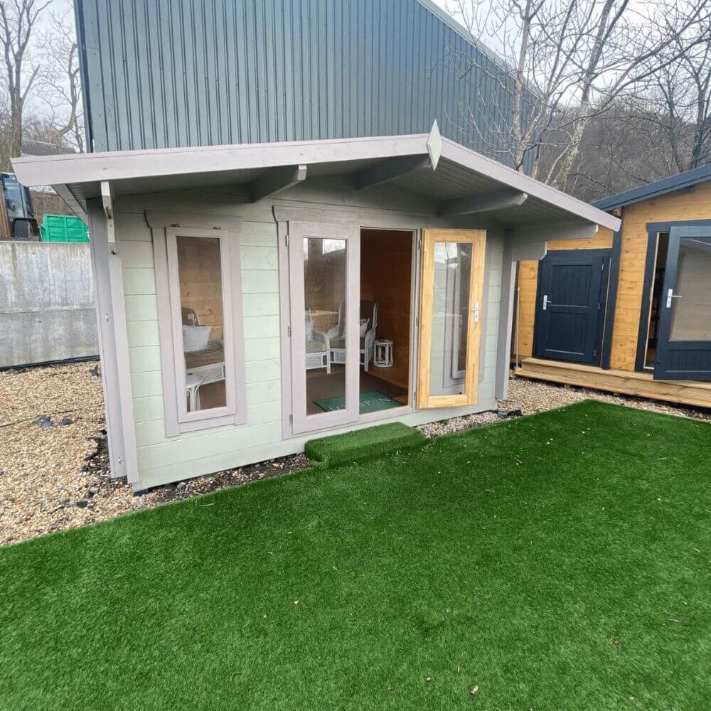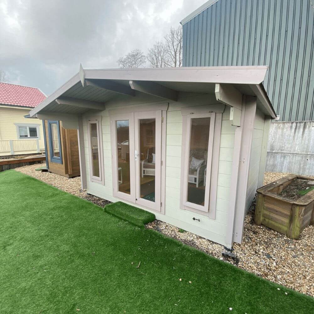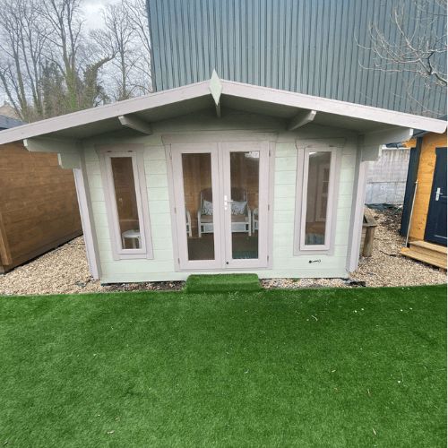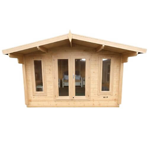 The Nesse Plus is a popular 28mm log cabin, known for its durability over the past decade. It features double French doors with floor-to-ceiling windows and a 1-meter overhang, creating a bright, spacious garden room or home office.